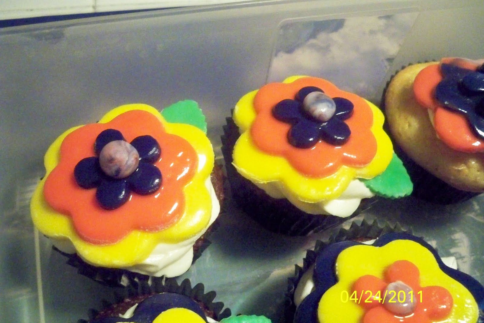 I started by baking 2 1/2 dozen cupcakes, some chocolate, some vanilla. Then I decorated them. Some like this with large frosting flowers