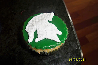 The other was a circle of green fondant topped with a white "Sparty". Sparty is MSU's mascot. To make Sparty I found a picture of him online, printed the picture, put waxed paper over it and traced Sparty with white royal icing. Once Sparty had hardened I added him to the top of the cupcake with a little icing.